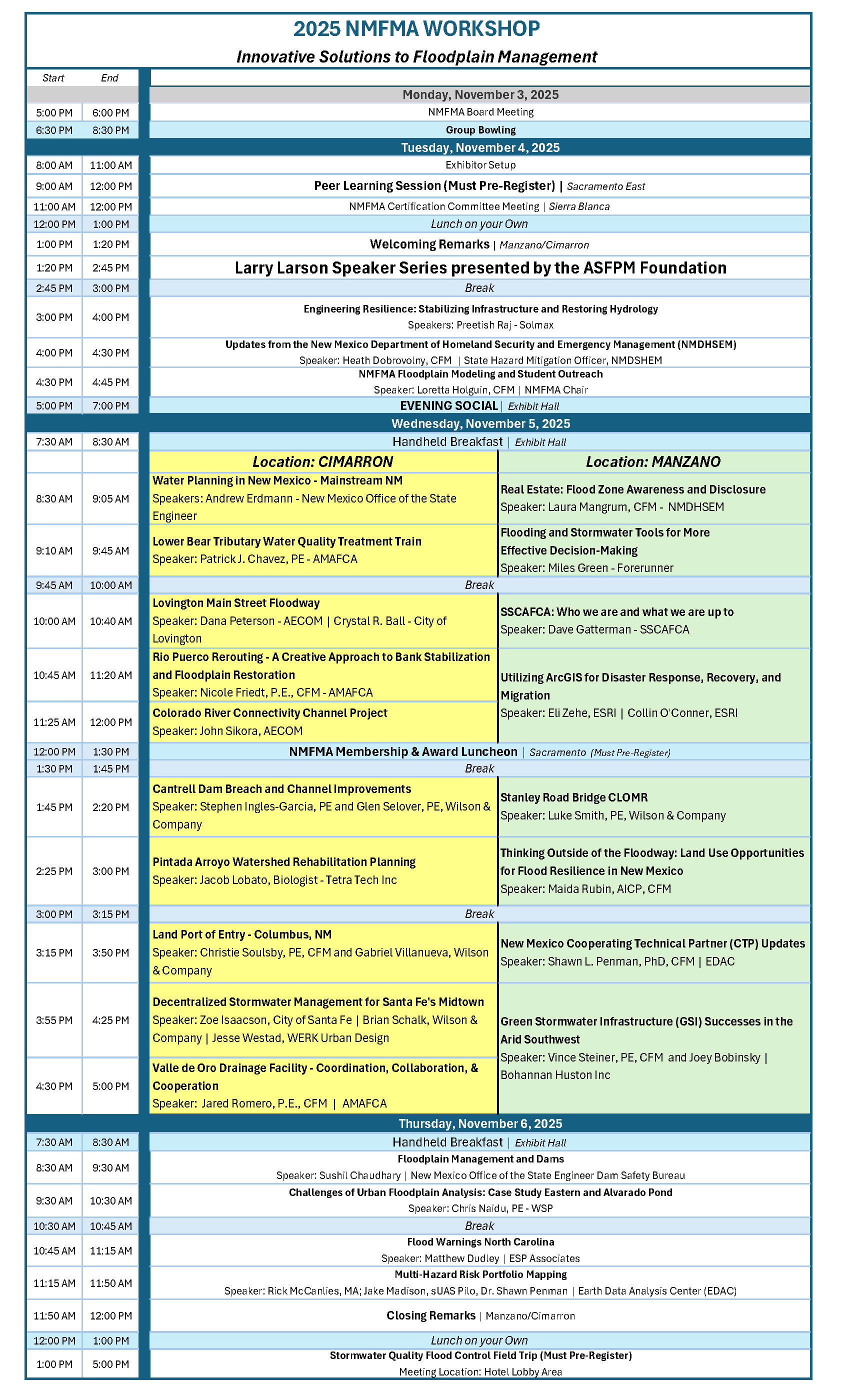 Thank you to everyone who attended, sponsored, and helped make the 2025 NMFMA Workshop a success! Congratulations to the recipients of the 2025 NMFMA Workshop Awards! 2025 Service Award - Angela Valdez, Wilson & Co. 2025 NMFMA Floodplain Manager of the Year Award - Brian Houghtalin, Chavez County Flood Commission 2025 Grant Pinkerton Service Award - Jared Romero, AMAFCA Want to volunteer for next year's workshop? Contact Wendy Blackwell wendy@wmblackwell.com or (505) 469-8683 Click the buttons below to download the presentations from each session 2025 Workshop Speaker Abstracts & Bios